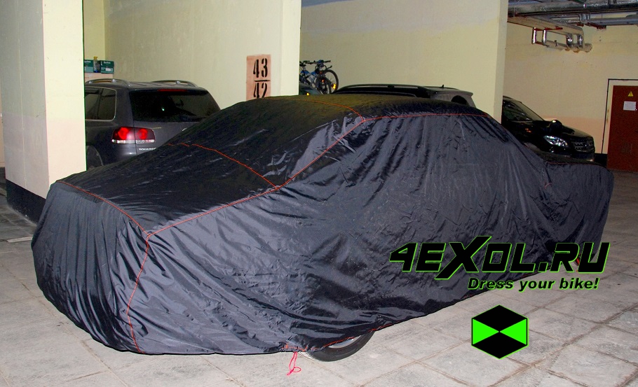Тент затягивается по-кругу шнуром, с кнопками-фиксаторами в районе колёс. Достаточно немного вытянуть шнур и тент плотно обтянет автомобиль, под бампера.