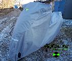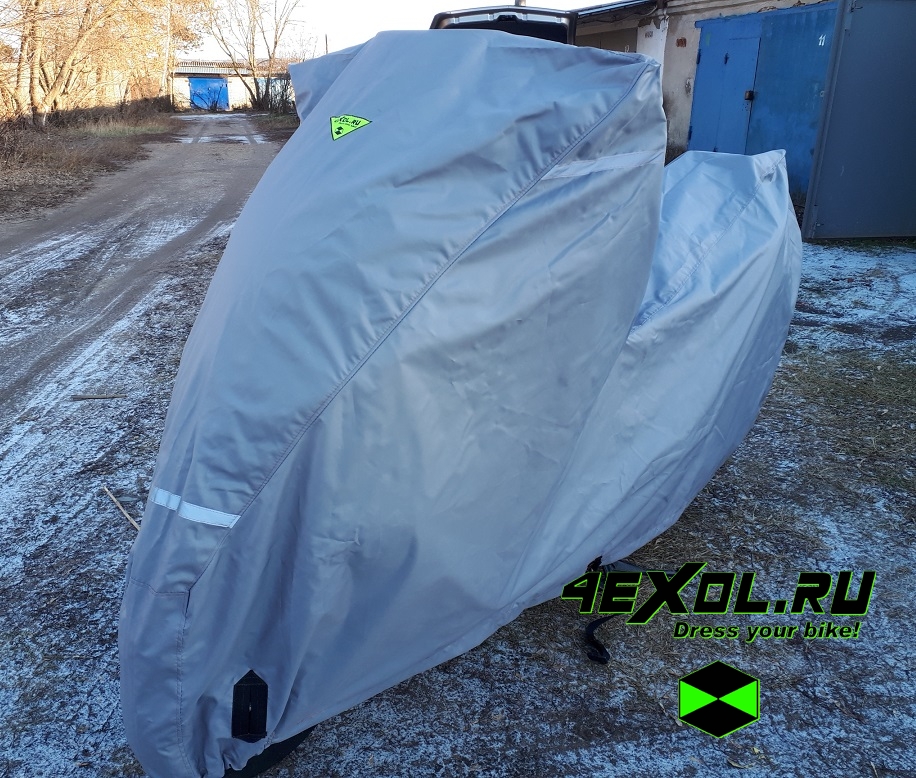 Чехол затягивается снизу, спереди и сзади шнурками, с удобными кнопками фиксаторами. Достаточно потянуть за шнур и чехол плотно обтянет мотоцикл, под колёса.